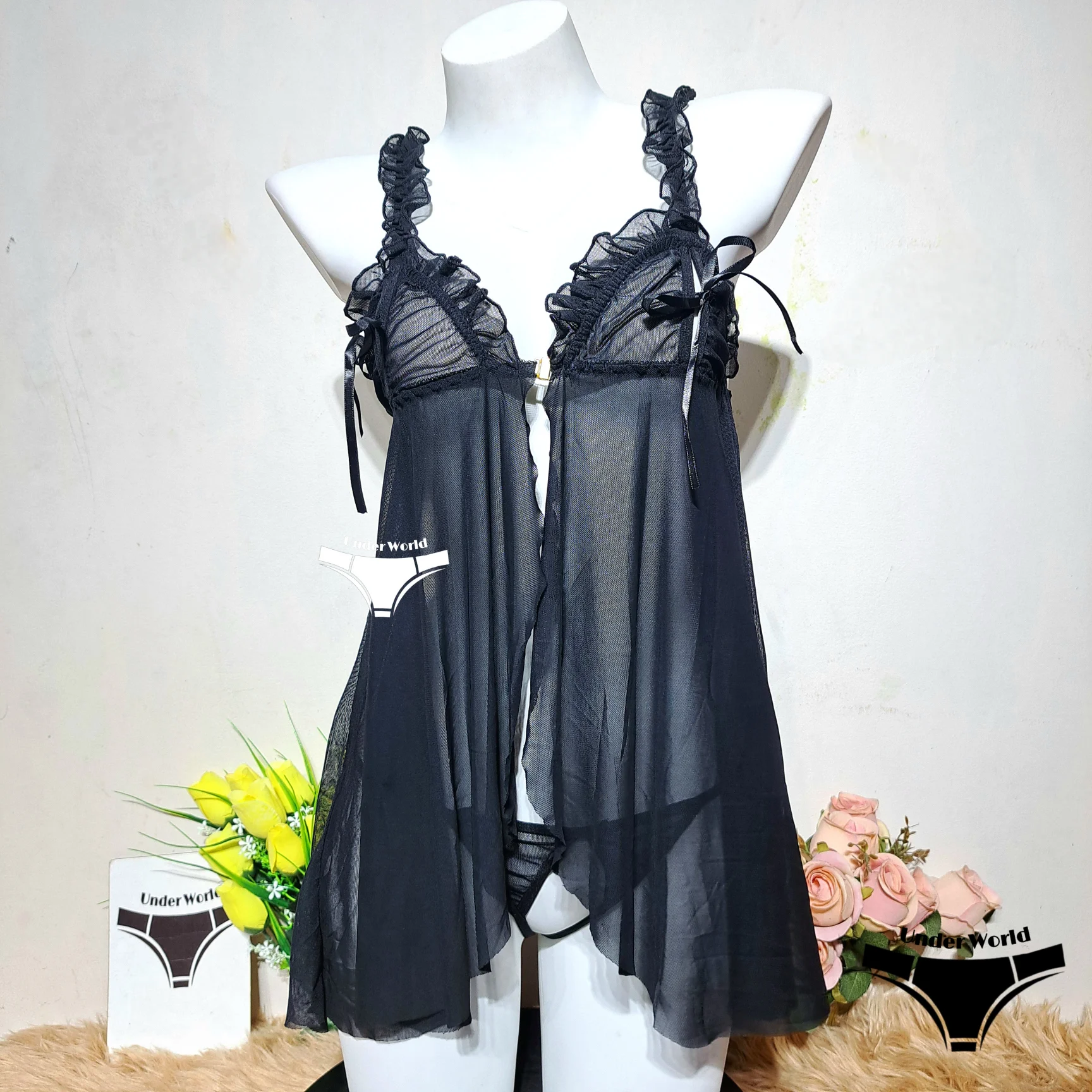 Premium Black Short Fancy Elastic Mesh Transparent Nighty & Panty Honeymoon Special Edition